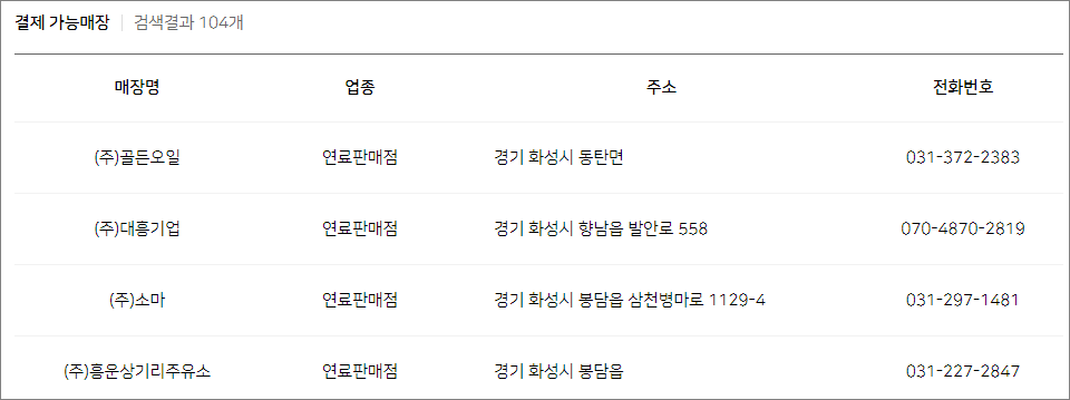 5. 주유소 항목을 선택한후 검색을 눌러 주세요 그렇다면 아래의 일부 예시와 같은 지역화폐 이용이 가능한 점포 리스트를 확인할수 있습니다.